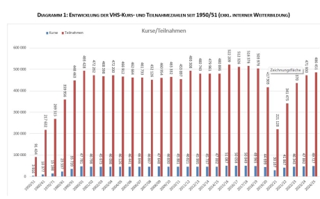 30.03.2026Die Leistungsstatistik der Österreichischen Volkshochschulen weist für das Kursjahr 2024/25 49.767 Kurse (inkl. gesamter Weiterbildung für Mitarbeiter*innen) aus, das bedeutet eine Zunahme der durchgeführten Kurse im Vergleich zum Arbeitsjahr 2023/24 um 3,8%. Die Teilnahmen im Kursbereich steigen gegenüber dem Vorjahr um 3,1%. Insgesamt sind im Arbeitsjahr 2024/25 487.398 Teilnahmen in Kursen (inkl. gesamter Weiterbildung für Mitarbeiter*innen) zu verzeichnen. Weiters wurden 6.328 Einzelveranstaltungen angeboten und von 183.106 Menschen besucht.
